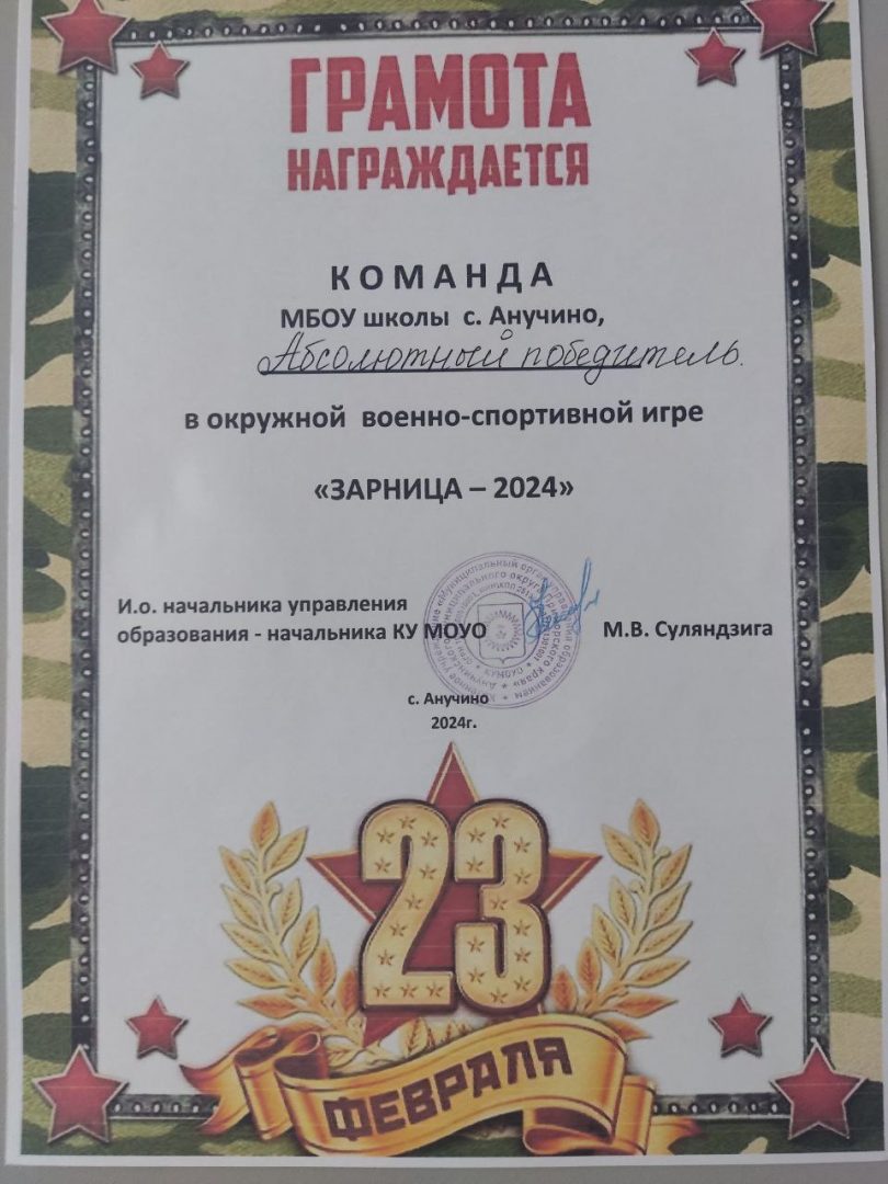 Команда управления образования выражает слова благодарности Савельеву И.В., Абрамовой Т.В., Замыслову С.С. за помощь в проведении военно-спортивной игры «Зарница».