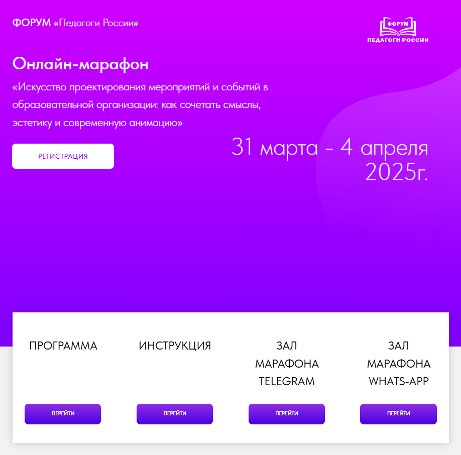 Приглашаем вас принять участие в онлайн-марафоне «Искусство проектирования мероприятий и событий в образовательной организации: как сочетать смыслы, эстетику и современную анимацию», который станет настоящим кладезем знаний и вдохновения для тех, кто стремится сделать образовательные события незабываемыми. Марафон пройдет с 31 марта по 4 апреля 2025 года. В рамках марафона вы узнаете, как превратить публичный отчёт руководителя в захватывающий гала-концерт, как вдохнуть новую жизнь в торжественные линейки и последние звонки, сохранив при этом их традиционную ценность. Мы рассмотрим, как с помощью современных анимационных техник и эстетических решений создавать мероприятия, которые будут не только интересными, но и глубоко осмысленными для всех участников образовательного процесса. Курс, общей продолжительностью 36 часов, позволит вам не только получить теоретические знания, но и освоить практические навыки. По завершении каждого модуля участники получат электронные сертификаты, а по окончании всего марафона – итоговый электронный диплом. Подробная информация доступна по ссылке: https://school-detsad.ru/teaorg. Присоединяйтесь, чтобы вместе создавать будущее образовательных событий!