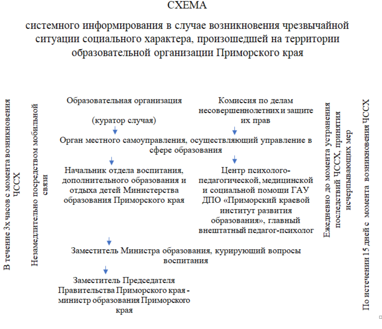 Образовательная организация — начальник управления образования (специалисту управления образования) — Комиссия по делам несовершеннолетних и защите их прав — Начальник отдела воспитания, дополнительного образования и отдыха детей Министерства образования Приморского края — Центр психолого-педагогической, медицинской и социальной помощи ГАУ ДПО «Приморский краевой институт развития образования», главный внештатный педагог-психолог — Заместитель Министра образования, курирующий вопросы воспитания — Заместитель Председателя Правительства Приморского края — министр образования Приморского края