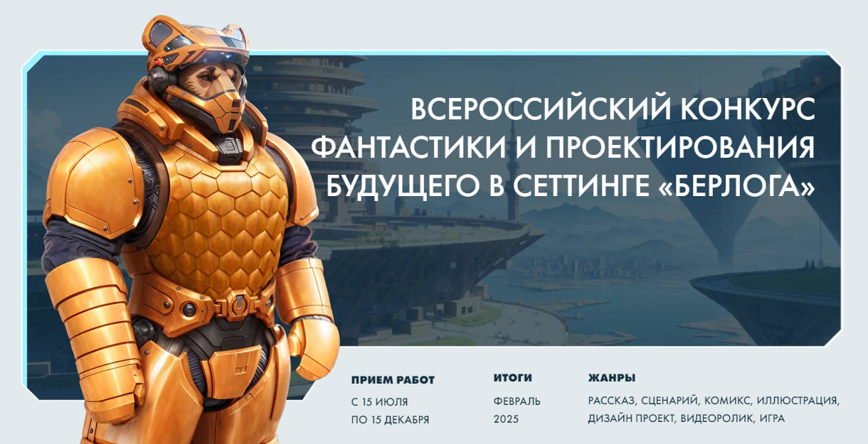 ? Национальная киберфизическая платформа «Берлога» выпускает полезные видеоигры в фантастическом сеттинге о технологически продвинутых медведях. В играх школьники могут научиться программировать дронов, а также имеют возможность посещать профильные образовательные мероприятия и технологические кружки. Номинации конкурса: ✅ Рассказ по миру «Берлоги» ✅ Фантастическая сказка для малышей по миру «Берлоги» ✅ Сценарий комикса по миру «Берлоги» ✅ Комикс по миру «Берлоги» ✅ Иллюстрация, связанная с миром «Берлоги» ✅ Серия иллюстраций (от 6 иллюстраций, связанных одной историей, и подробно демонстрирующая жизнь в мире техноутопии) ✅ Концептуальный дизайн-проект (проект устройства, здания, транспортного средства из мира «Берлоги») ✅ Настольная игра о мире «Берлоги» ✅ Компьютерная игра о мире «Берлоги» ✅ Тизер игры по миру «Берлоги» ✅ Видеоролик с оригинальным сюжетом по миру «Берлоги» Положение Подробнее на официальном сайте проекта