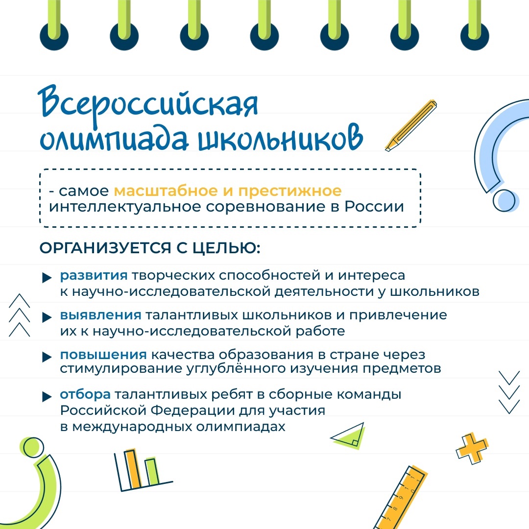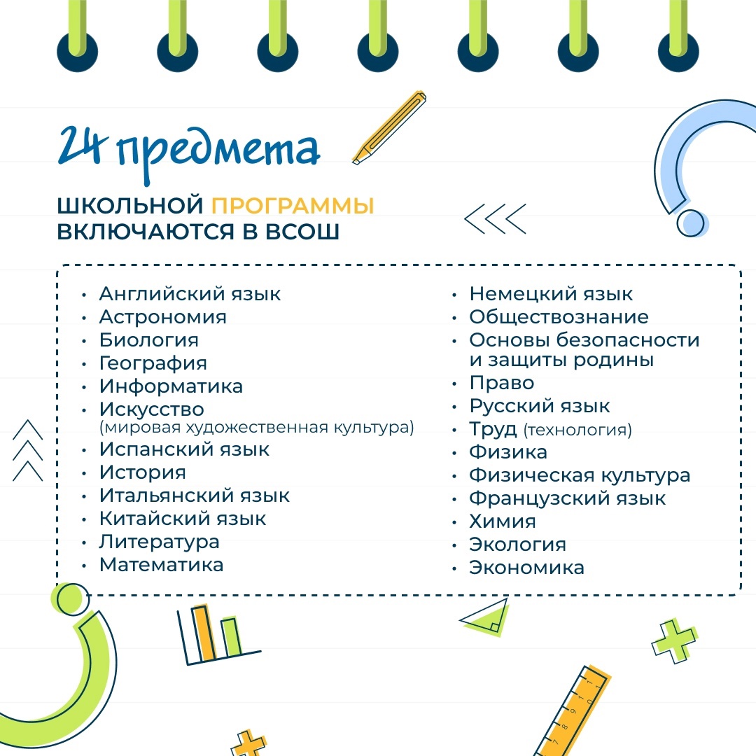 Олимпиада охватывает 24 предмета, среди которых такие ключевые дисциплины, как математика, русский язык, физика, химия, биология, история, информатика и литература и многие другие.
