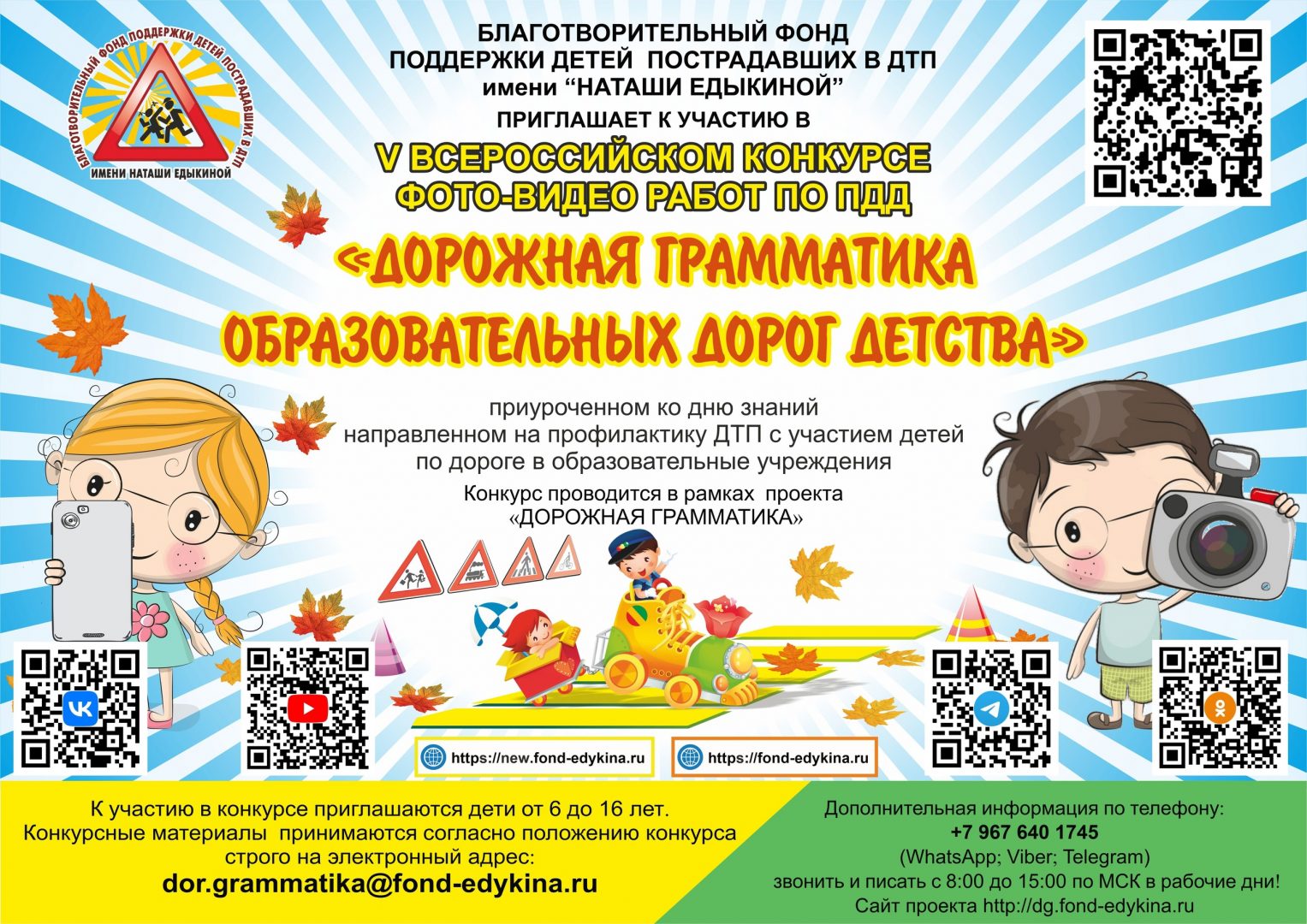 Благотворительный фонд поддержки детей пострадавших в ДТП имени «Наташи Едыкиной» предлагает создать фото или видео работы на тему правильного поведения детей на улице осенью К участию в конкурсе приглашаются дети от 6 до 16 лет. ? Сроки проведения: 02 сентября – 18 ноября 2024 года. ? Конкурсные материалы принимаются согласно положению конкурса строго на электронный адрес: dor.grammatika@fond-edykina.ru ? Сайт проекта: http://svetofor.fond-edykina.ru ? Организатор конкурса: Благотворительный фонд поддержки детей пострадавших в ДТП имени «Наташи Едыкиной» ?Положение конкурса ? Заявка – участника ✅ Согласие на обработку персональных данных и использование изображения ? Приложение Дополнительная информация по телефону: ? +79676401745 ? Приём звонков и сообщений с 8:00 до 15:00 по Московскому времени в рабочие дни!