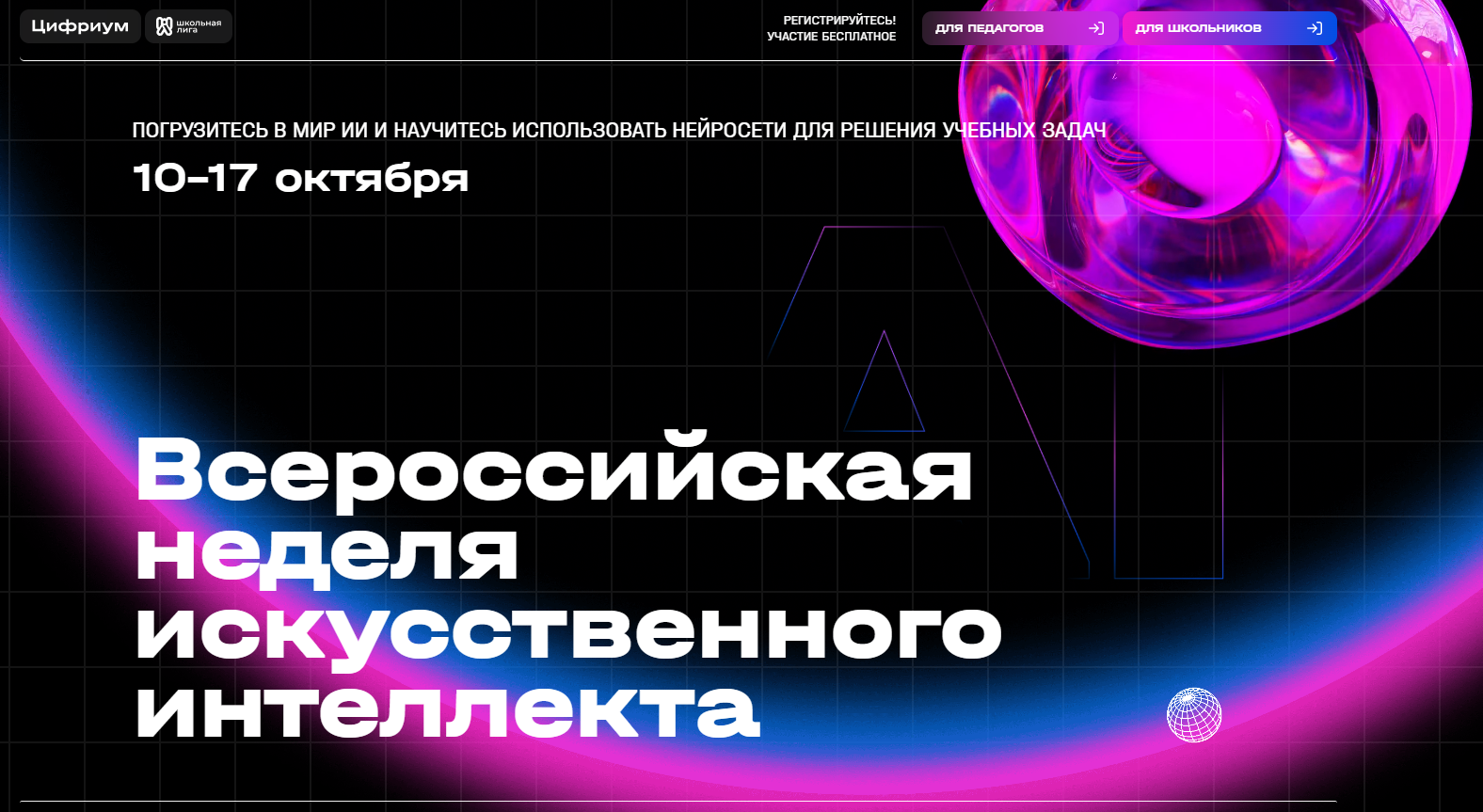 Цифриум и Школьная лига приглашают педагогов и школьников 5-11 классов принять участие в онлайн-проекте «Всероссийская неделя искусственного интеллекта», который пройдет с 10 по 17 октября 2024 года. ➡Что ждет педагогов?