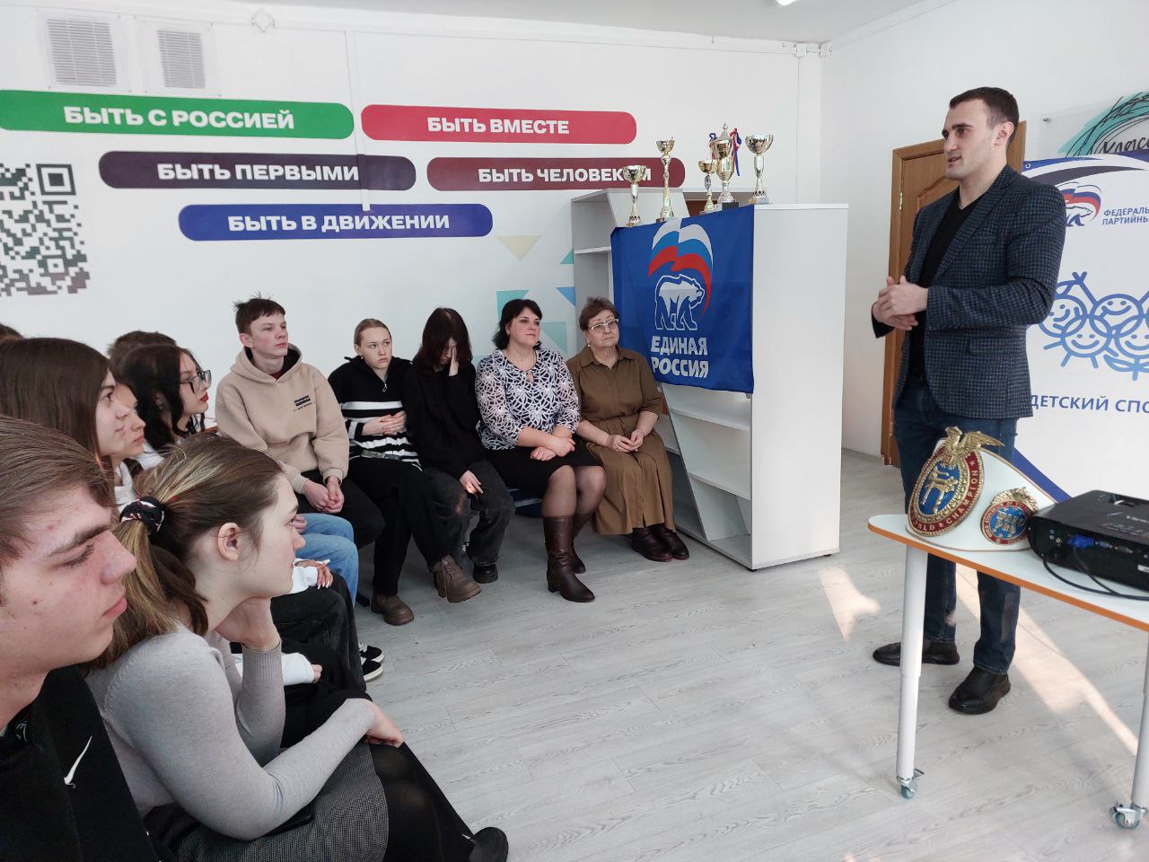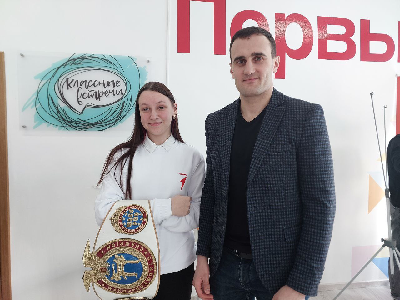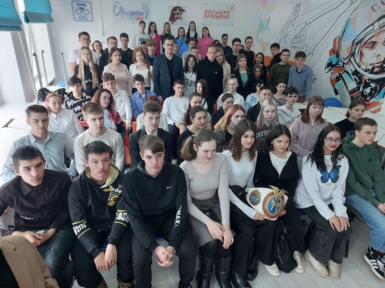 Ребята узнали и о нелёгком пути на "спортивный олимп", о главных боях в жизни спортсмена, о том, как обычный парень получил титул "Чемпион мира" по кикбоксингу.